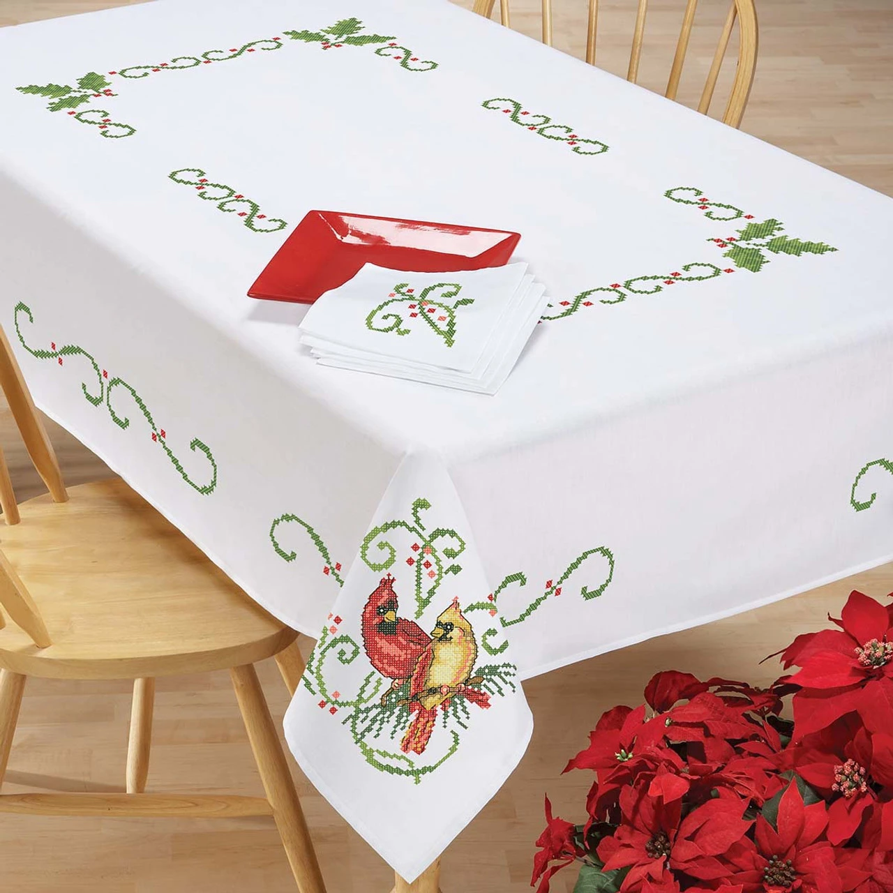 Vibrant cardinals dress up your table with an air of elegance. Stamped for cross-stitch on white polyester/cotton fabric with a hemmed edge. Imported.
