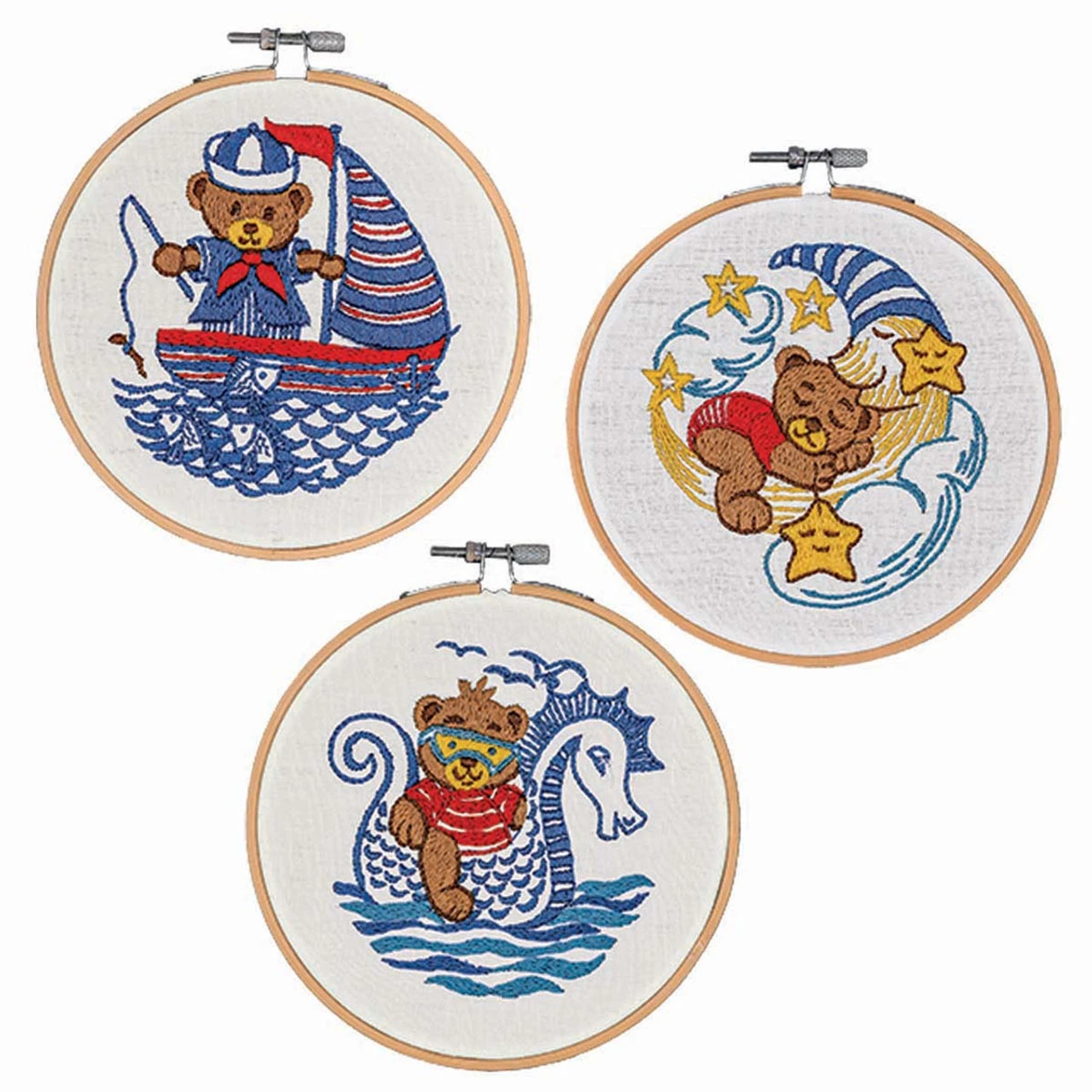 These sweet embroidery designs feature a teddy bear having a variety of adventures! After nautical adventures all day from riding a seahorse across the ocean or fishing from the side of a sailboat, this teddy is tired and ready for bed as he snuggles up with a sleeping crescent moon surrounded by stars. The playful imagery makes darling wall art for the nursery. The design is stamped for embroidery on ivory cotton/linen fabric, meaning there is no need to transfer or trace the design. Simply follow the easy-to-read chart and instructions to stitch the design. Kit includes stamped ivory cotton/linen fabric, cotton floss, bamboo hoop, and instructions. Needle is not included. The finished design measures 6″ (15.2cm) dia. Imported from Europe.