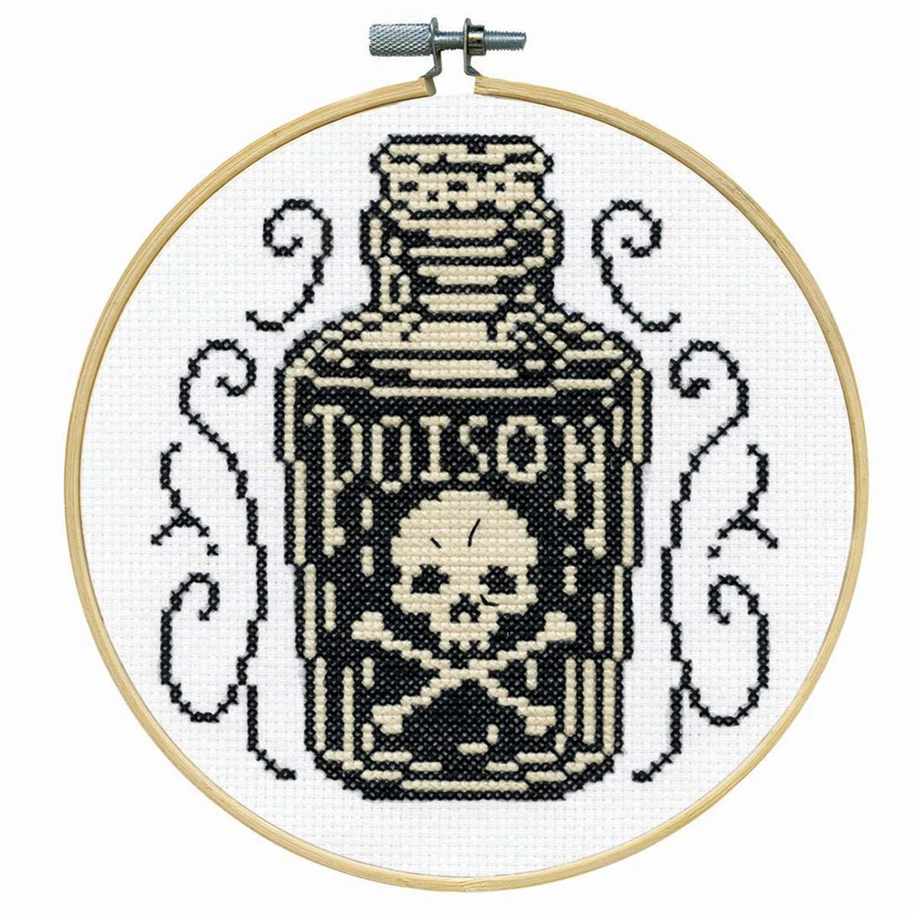 • Design features a bottle of witch’s poison with a skull and crossbones on the bottle and curlicues on each side.
