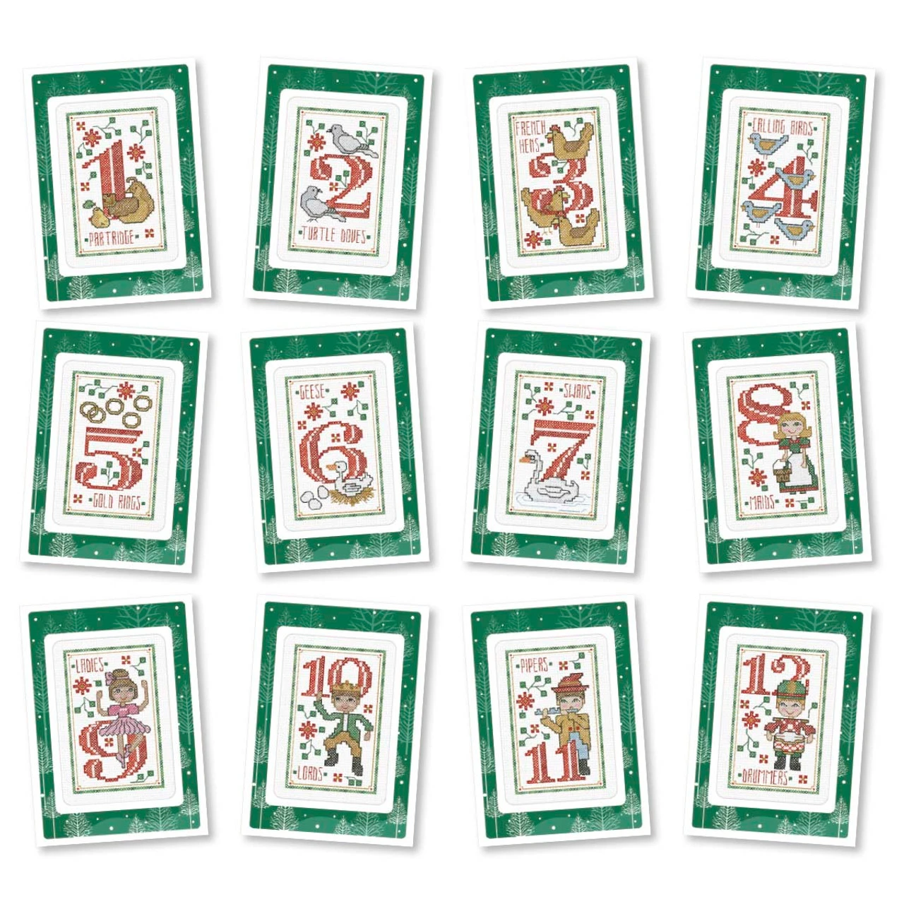 Send hand-stitched greetings for all 12 days of Christmas! Counted cross-stitch kit includes white 14-ct. aida cloth, cotton floss, floss organizer, needle, and trifold cards with envelopes. Set of 12. 5 × 7″ (12.7 x 17.8cm). Imported.
