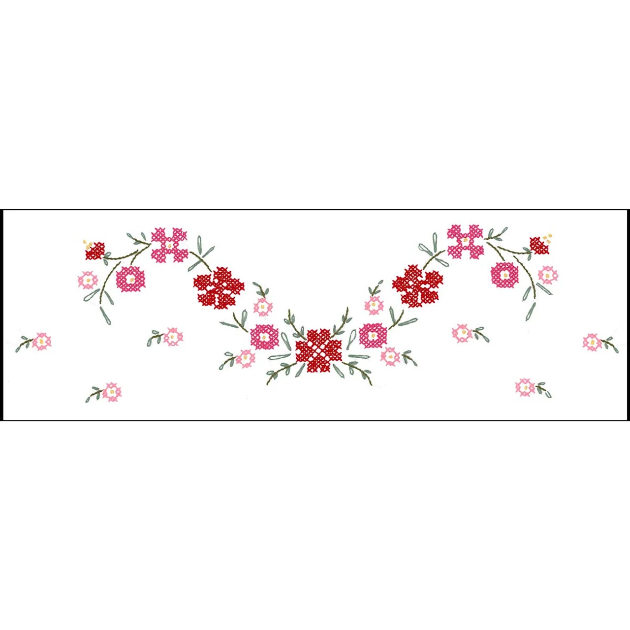 • This pre-finished dresser scarf is ready for stitching with a variety of pink and red blossoms with little green leaves.