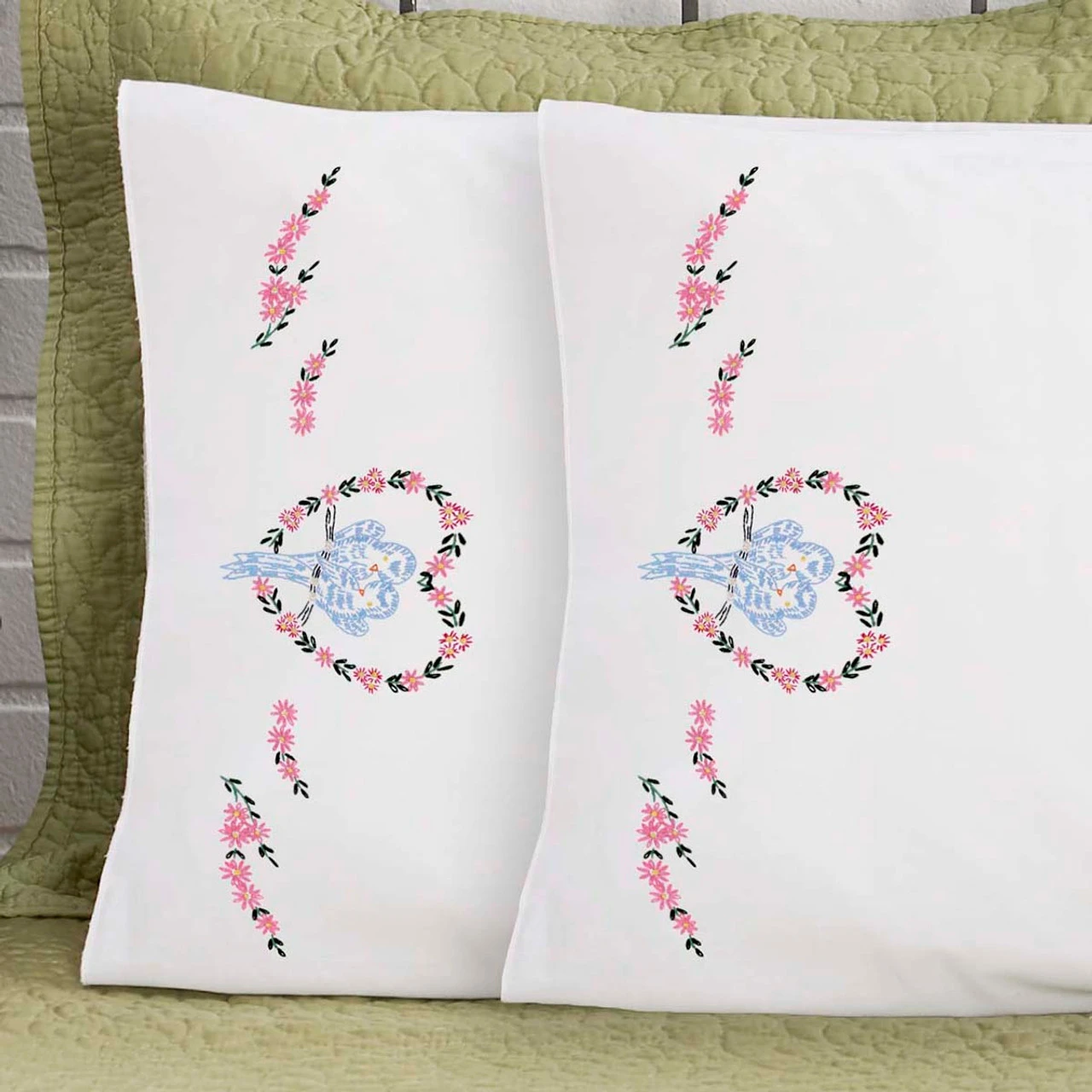 This darling duo makes a heartfelt wedding gift for the happy couple. Preserve the best of the past with the Revival collection, a selection of vintage needlework designs preserved from the archive and re-created for modern stitchers. Stamped for embroidery on white cotton/polyester fabric with a perle edge. Pair includes two 20 × 30″ (51 x 76cm) pillowcases. Imported.