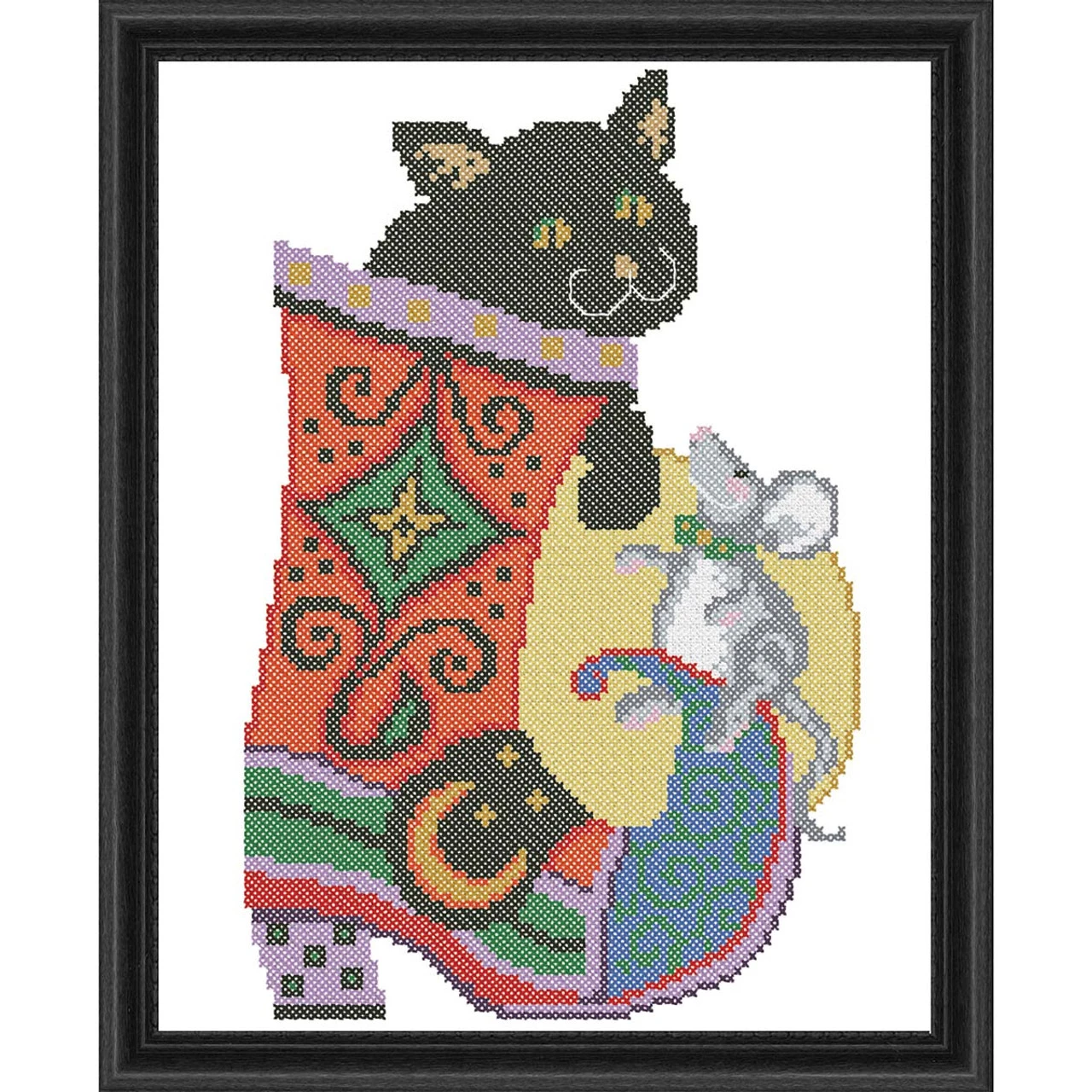 Brought together by their favorite holiday, this pair enjoys a fun Halloween accessory. Stamped for cross-stitch on white polyester/cotton fabric. Kit includes cotton floss and needle. 11 × 16″ (28 x 41cm). Made in U.S.A. and imported.