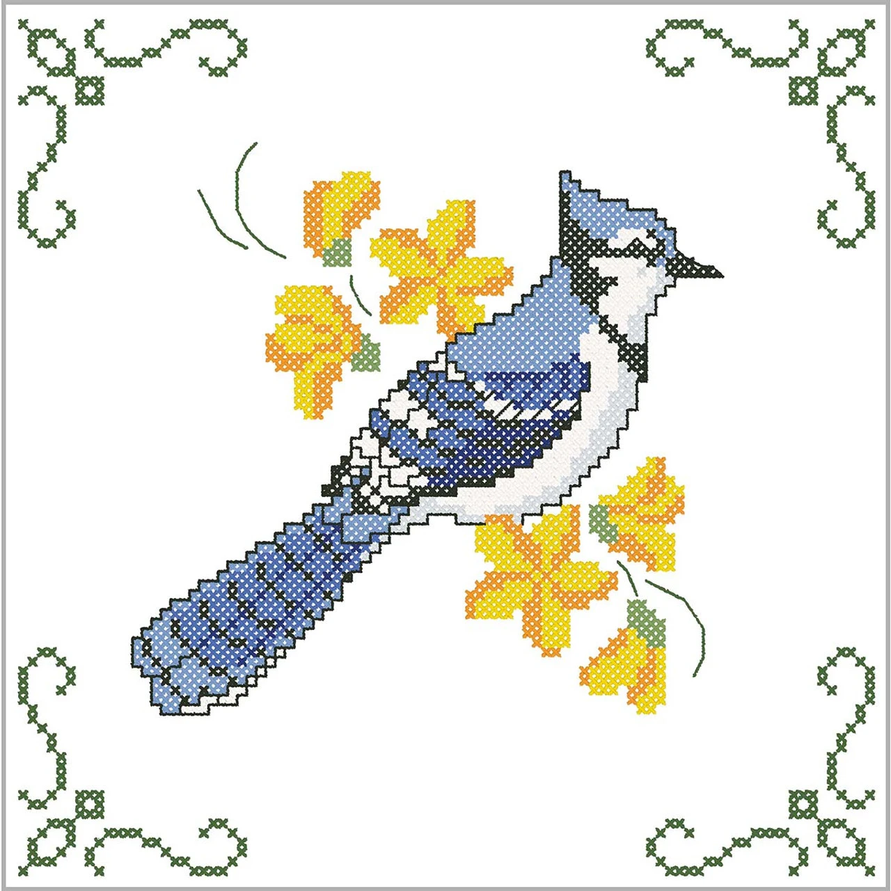 Handsome blue jays make a cheerful sign of spring in your home. Stamped for cross-stitch on white polyester/cotton fabric. Six 18 × 18″ (46 x 46cm) blocks. Imported.