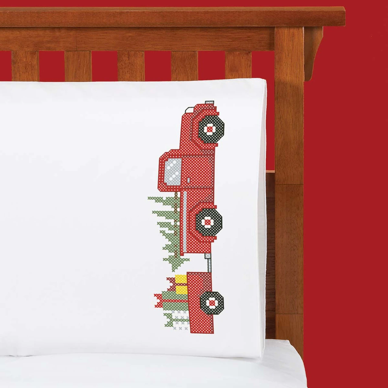 • These pre-finished pillowcases are ready for stitching with a red truck, Christmas tree, and Christmas presents.