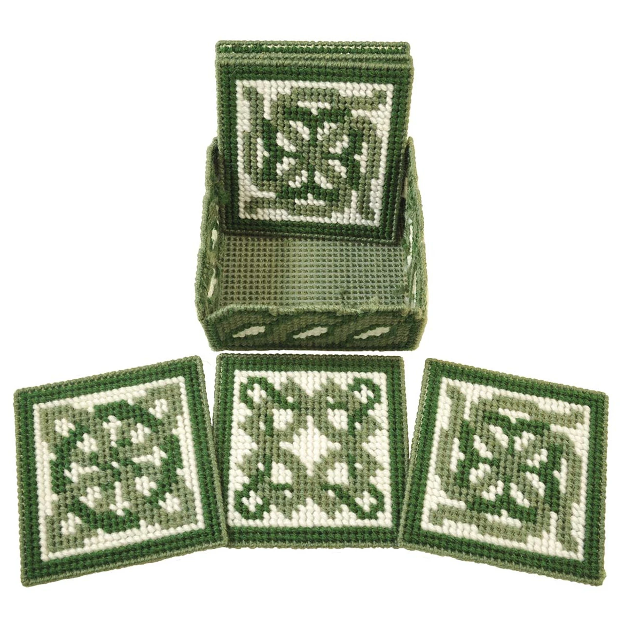 Decorate your home with traditional Celtic symbols. Kit includes 7-mesh plastic canvas, acrylic yarn, and needle. Set of six 4½ x 4½” (11.4 x 11.4cm) coasters and holder. Imported.