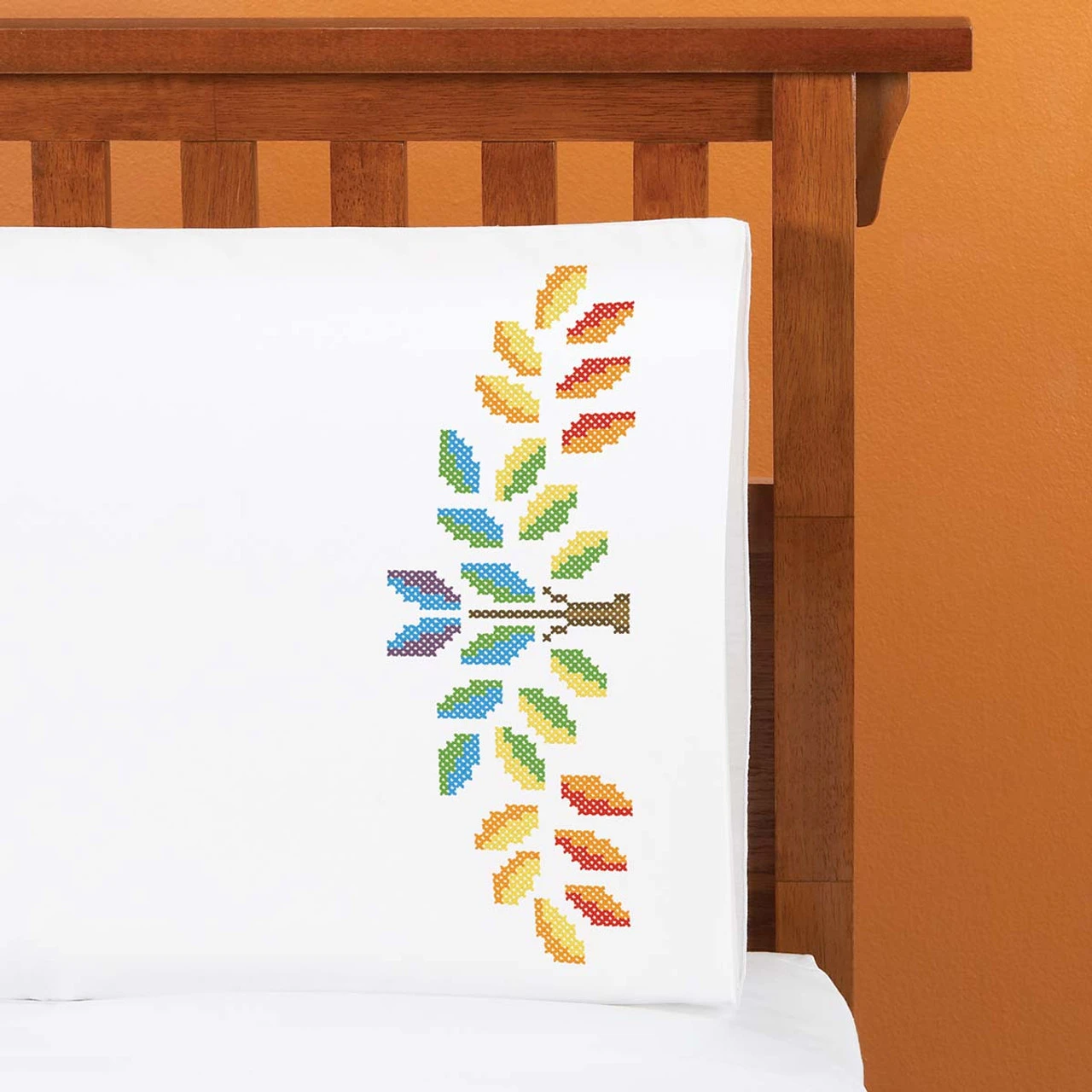A rainbow blooms across these pillowcases, showcases the changing colors of the seasons. Stamped for cross-stitch on fine-quality 180-thread count polyester/cotton fabric with a perle edge. Set of two. 20 x 30″ (51 x 76cm). Imported.