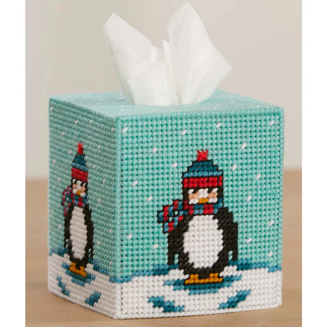 Brighten up snowy days with the penguin pal on this this winter tissue box cover. Stitched on 7-mesh plastic canvas, this wintry design is stitched with a cute little penguin bundled up against the snowy weather with a Christmas hat and scarf. The kit includes plastic canvas, acrylic yarn, needle, and complete instructions to stitch the 5 x 5½ x 5″ (12.7 x 14 x 12.7cm) tissue box cover. Imported.