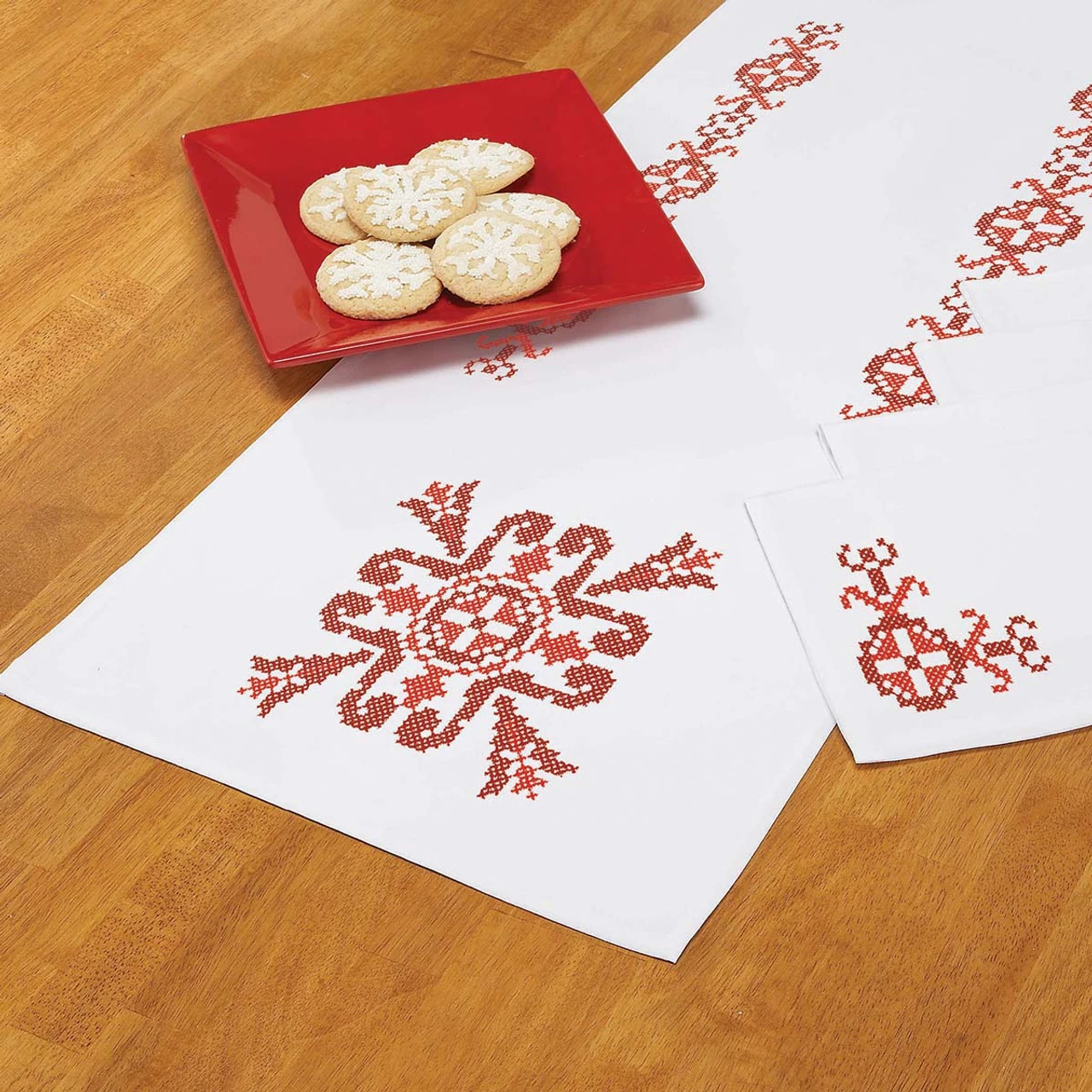 Set a merry Christmas table with peppermint-colored linens. Stamped for cross-stitch on white polyester fabric with a hemmed edge. 14 x 44″ (36 x 112cm) table runner; set of four 16 x 16″ (41 x 41cm) napkins. Imported.