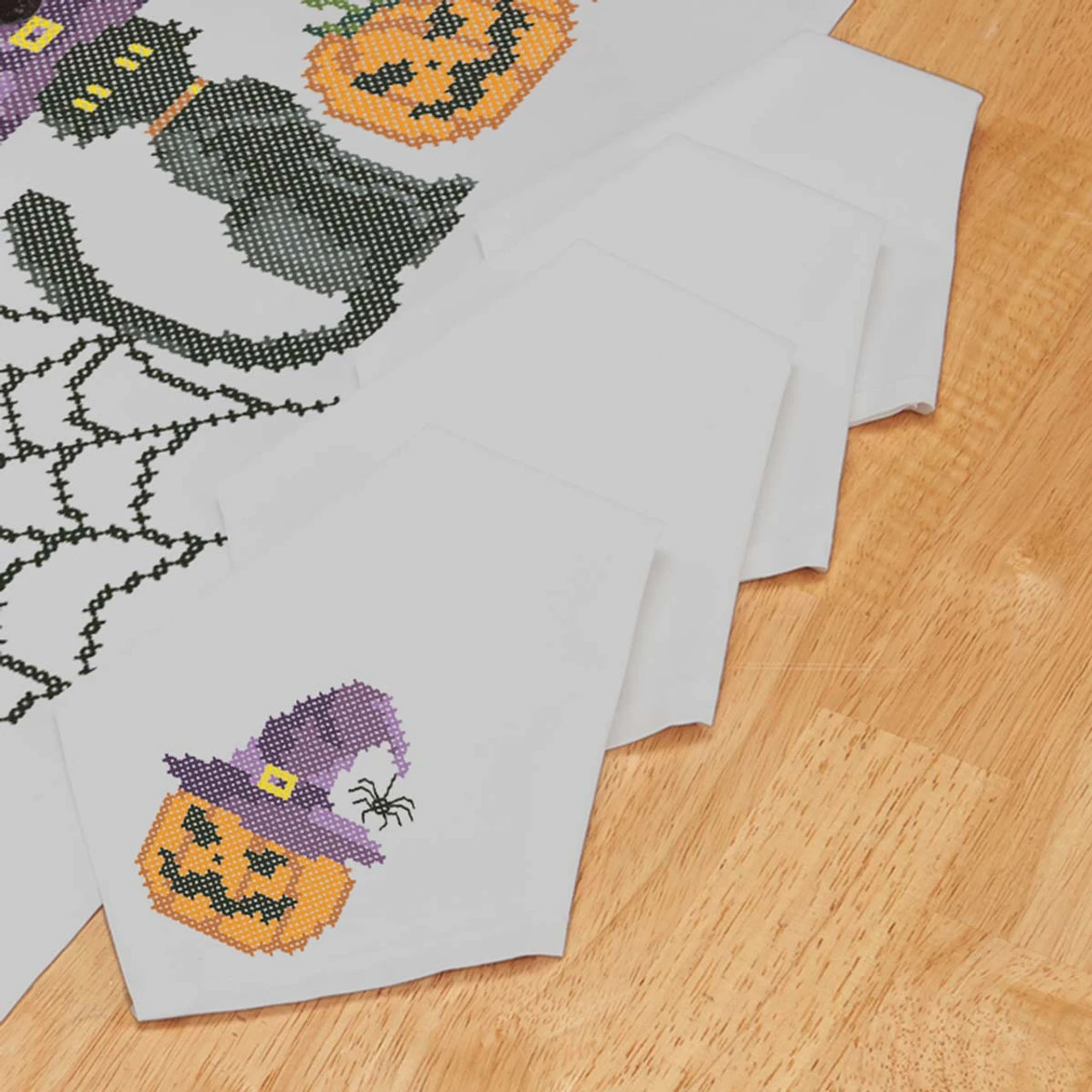 Give each dinner guest a jack-o’-lantern grin! Stamped for cross-stitch on gray polyester/cotton fabric with a hemmed edge. Set of four. 16 x 16″ (41 x 41cm). Imported.