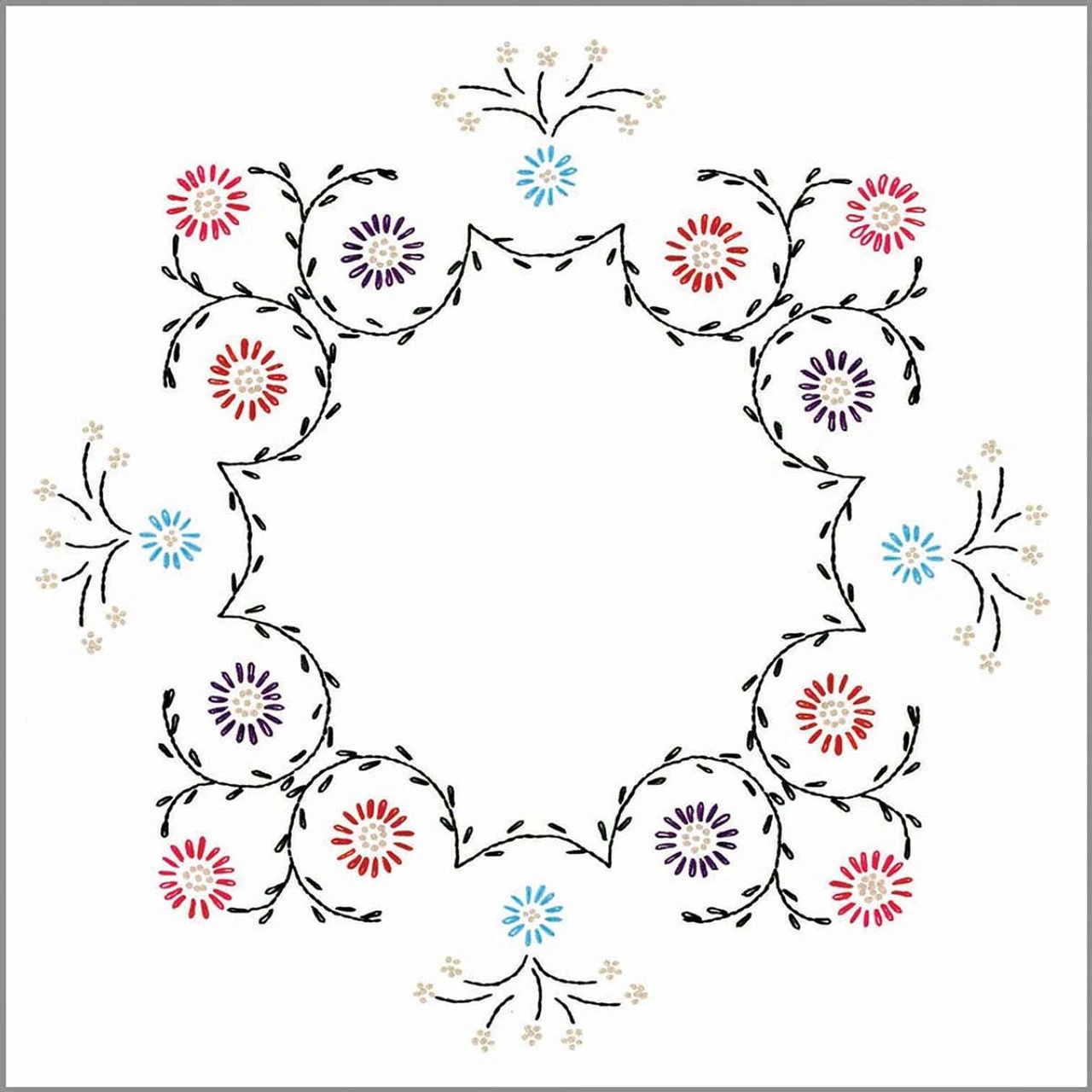 • These quilt blocks are ready for stitching with pink, blue, and purple flowers in a geometric wreath of green vines.