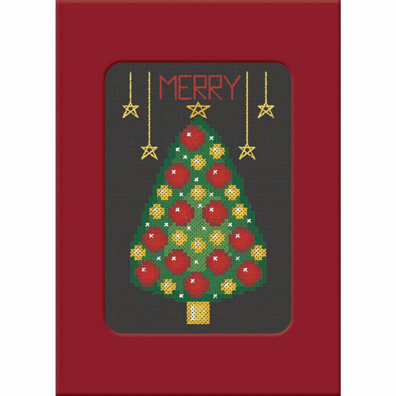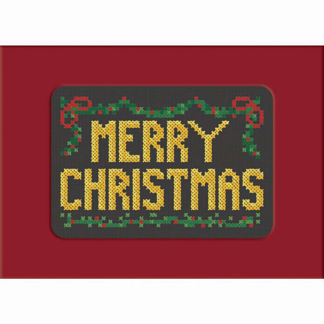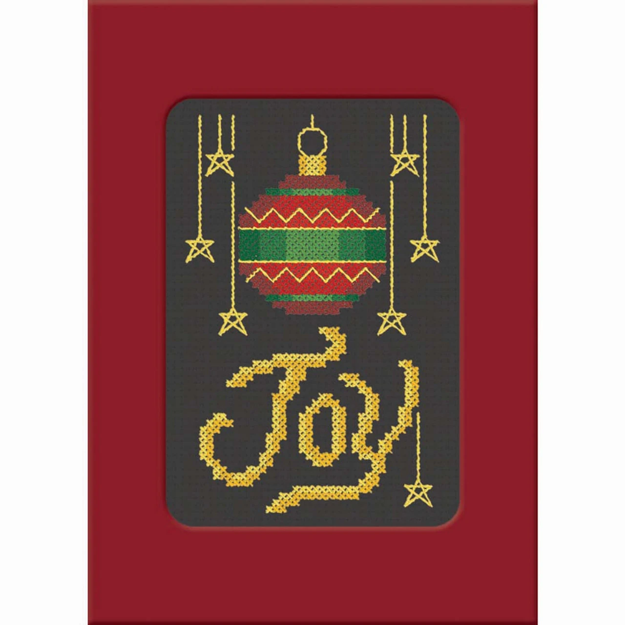 • This counted cross-stitch kit includes black 14-ct. aida cloth, cotton floss, red tri-fold cards with envelopes, needle, and instructions.
