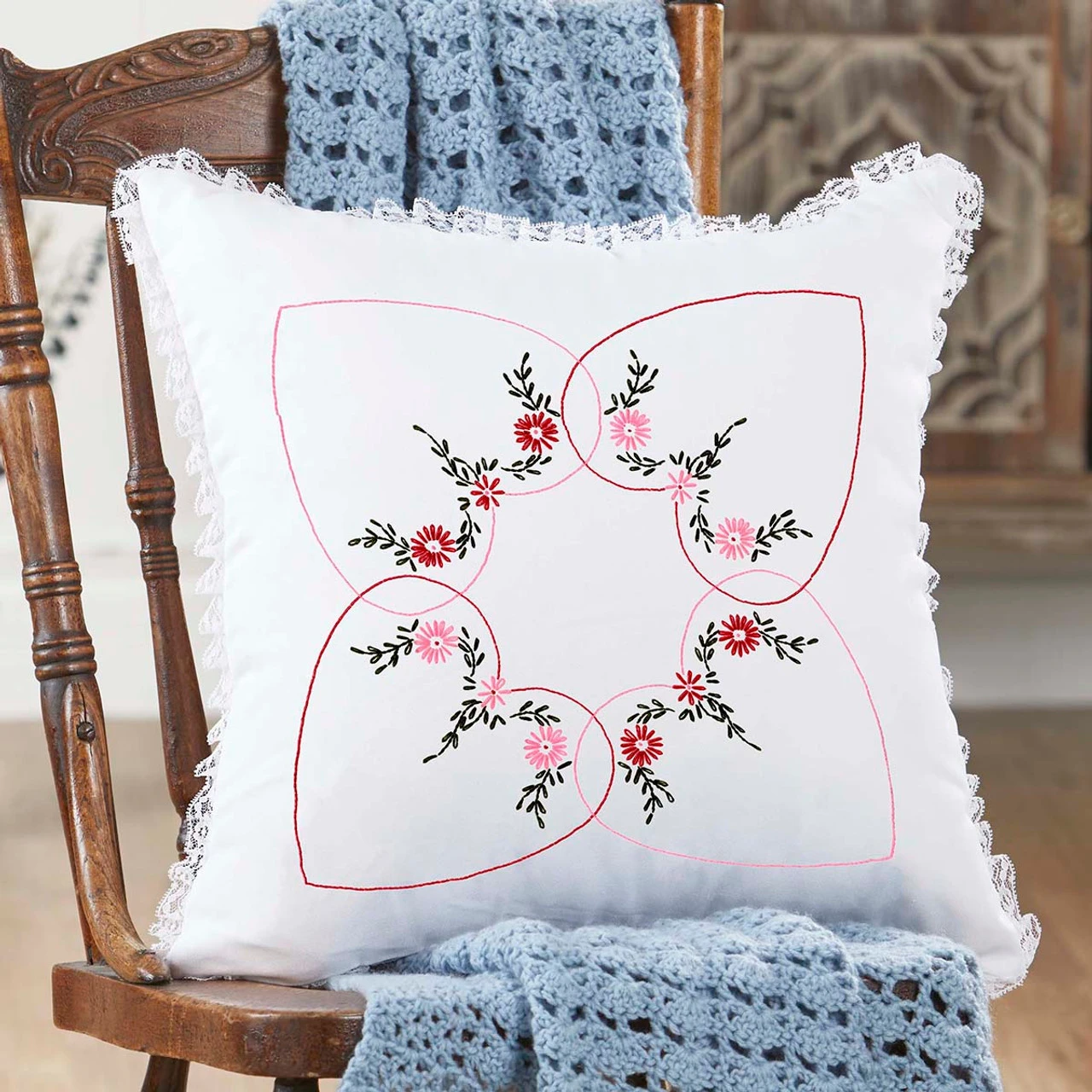 • The pillow cover is stamped for embroidery on a pre-finished white polyester/cotton pillow cover with a lace trim and a zipper closure.