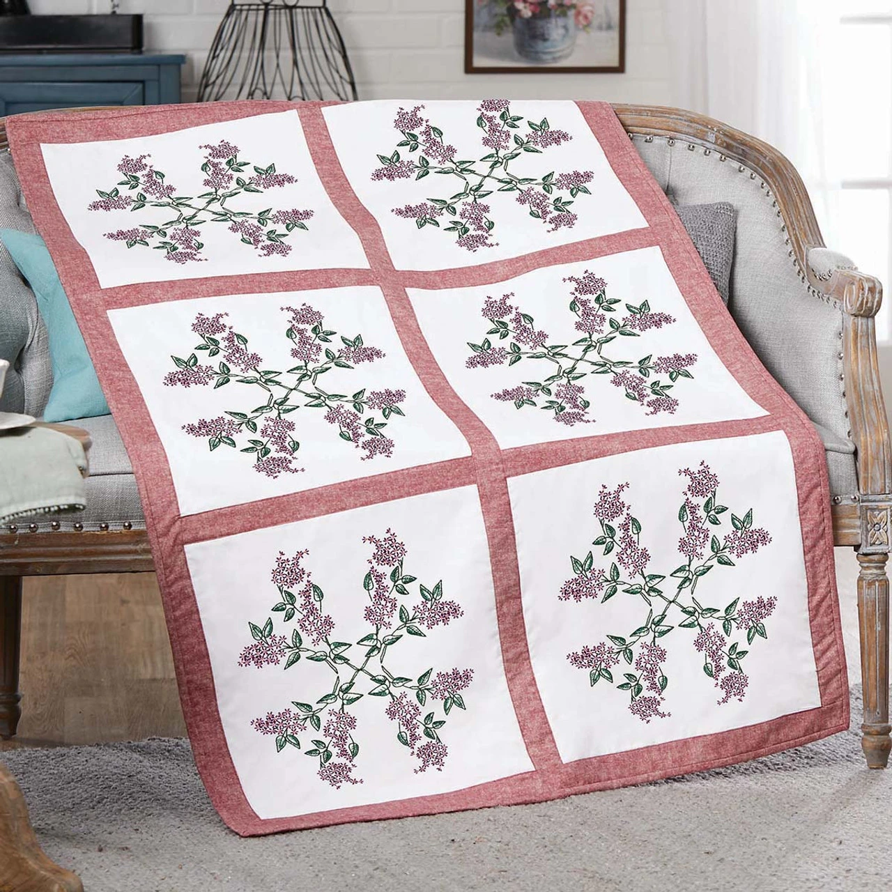 • These quilt blocks are ready for stitching with a geometric arrangement of dark green leaves and little violet blossoms.
