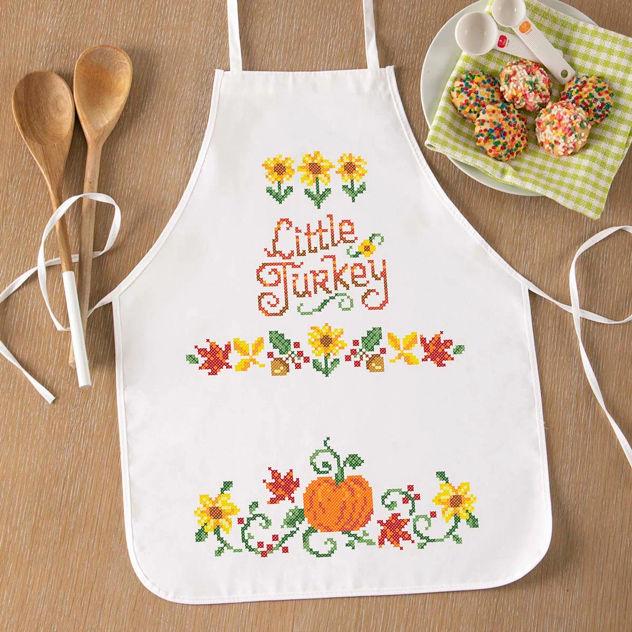 ⢠This pre-finished apron is ready for stitching with the words âLittle Turkeyâ, sunflowers, autumn leaves, and pumpkins.