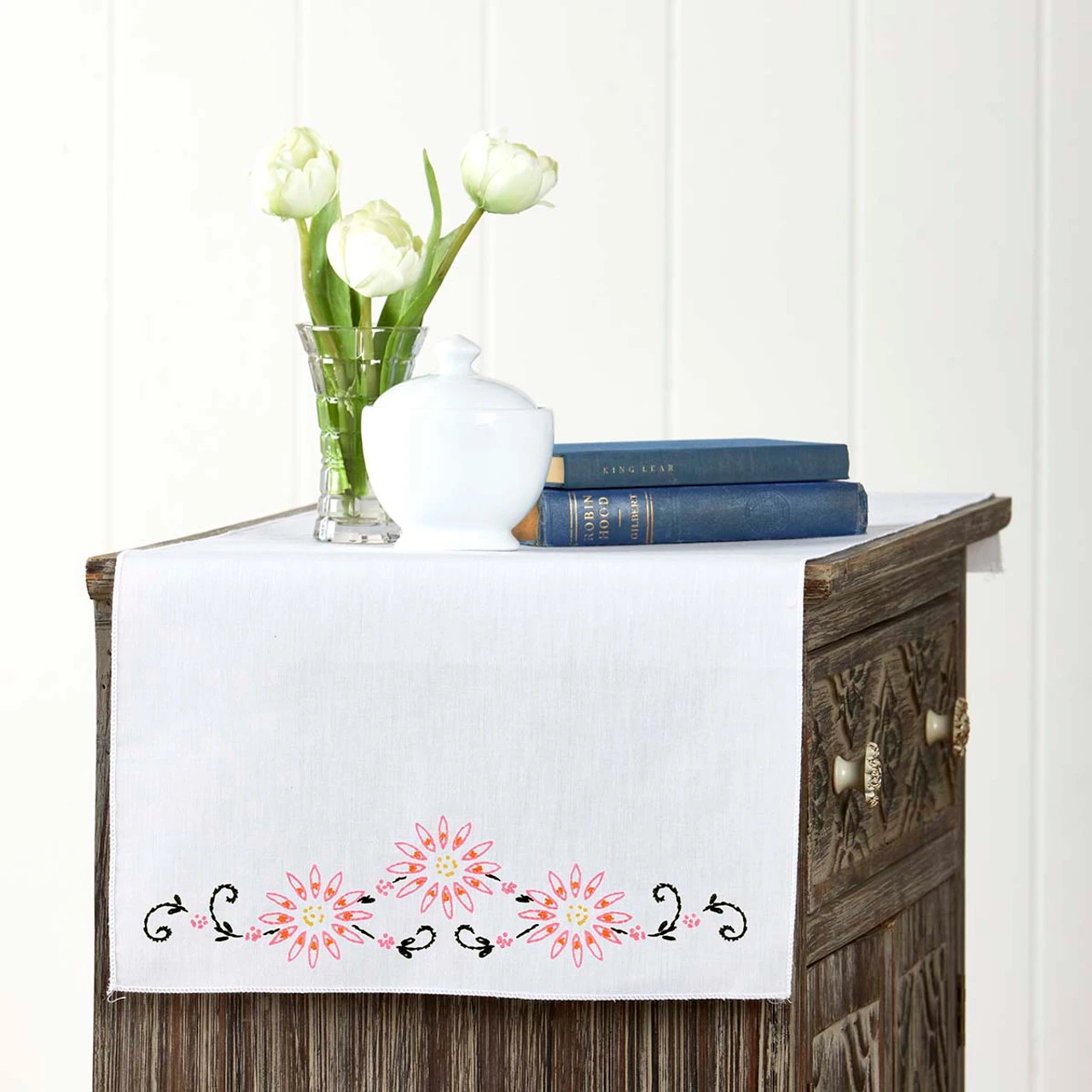 • This pre-finished dresser scarf is ready for stitching with a trio of pink flowers and green vines.
