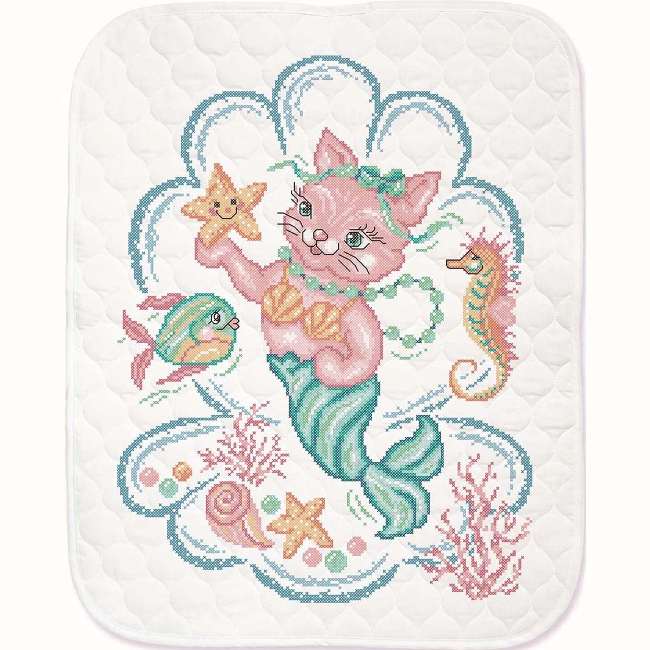 Enter a whimsical world under the sea with this kitty mermaid design! This playful design will spark your little one’s imagination as a sweet pink kitten with a mermaid tail befriends a starfish, fish, and seahorse as she explores the ocean world around her. Baby quilt is stamped for cross-stitch on pre-quilted white polyester/cotton fabric with a bound edge. As it is pre-quilted and pre-finished, there are no extra sewing or quilting skills needed. The kit includes everything you need to complete the project: the stamped baby quilt, cotton floss, floss organizer, needle, and stitching instructions. Simply follow the easy-to-read chart and instructions to cross-stitch stamped design on the baby quilt, and it is ready for the nursery! 34 x 43″ (86 x 109cm). Made in U.S.A. and imported.
