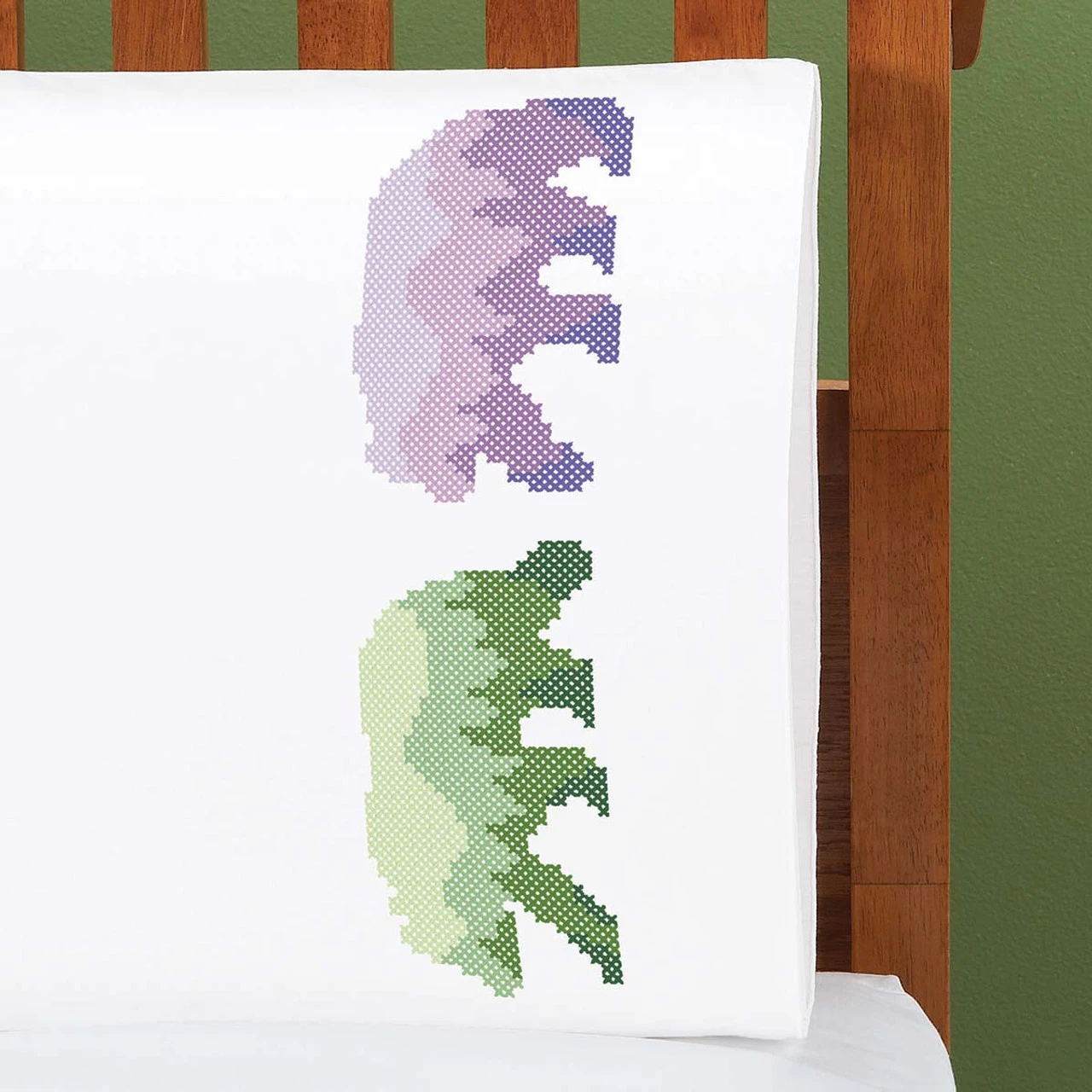 • These pre-finished pillowcases are ready for stitching with mountain landscapes in a gradient of green or purple in the shape of a bear silhouette.