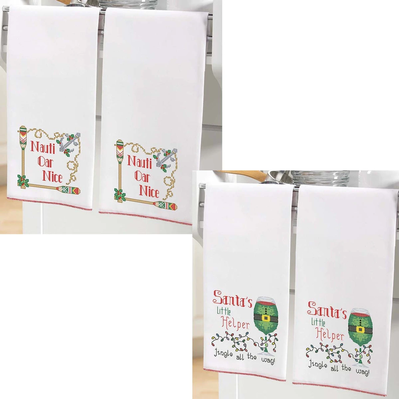 • These pre-finished towels are ready for stitching with an elf wine glass, Christmas lights, and the words “Santa’s Little Helper” and “Jingle all the way!” or a pair of oars and an anchor framing the words “Nauti Oar Nice.”