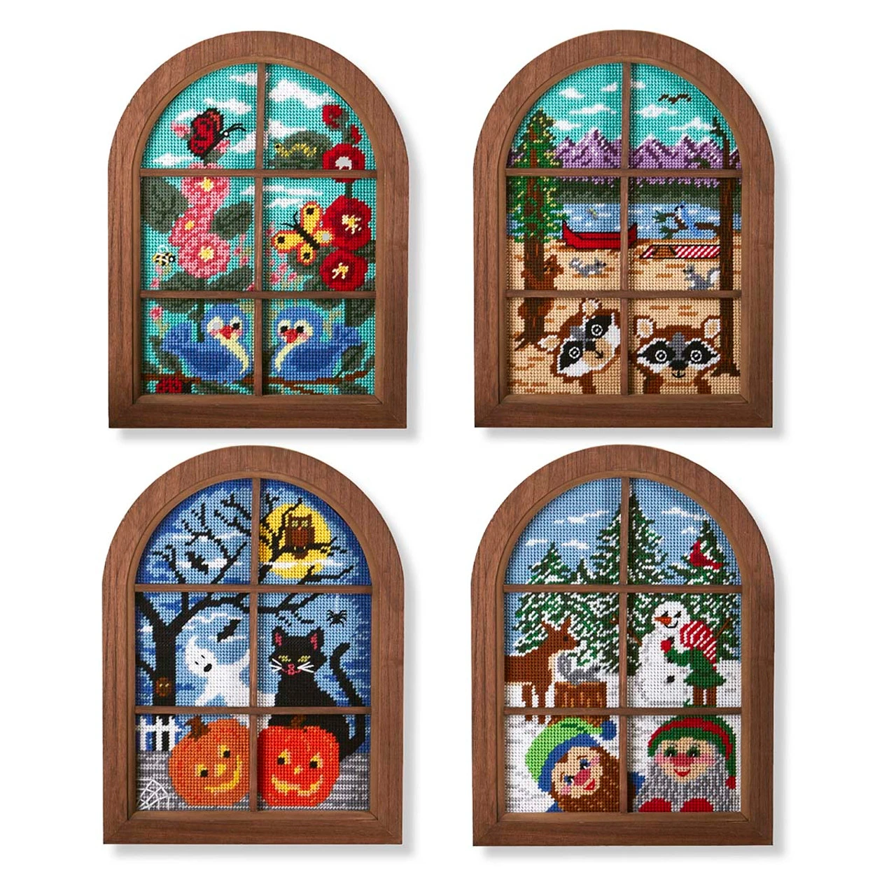 Save when you buy all four window wall hanging kits! These playful wall hangings are displayed in wooden window frames to give you a seasonal view from any room of your home! Get into the Halloween spirit with a haunting scene with jack-o’-lanterns, a ghost, black cat, owls, bats, and spider. Enjoy a day of summer fun at the lake with raccoons, a bear and squirrels. Celebrate spring as bluebirds perch among pink and red flowers visited by butterflies, a bee, a ladybug, and a caterpillar. Plus, get ready for winter fun in the snow with elves making a snowman in the company of woodland animals. This plastic canvas kit includes an arched wooden window frame, which is perfectly sized to fit the design and gives your finished project a professional display. Kits includes 7-mesh plastic canvas, acrylic yarn, needle, and complete instructions. This set also includes 1 wooden window frame to switch out the plastic canvas insert throughout the year. Each wall hanging measures 15 x 20″ (38 x 51cm). Imported.
