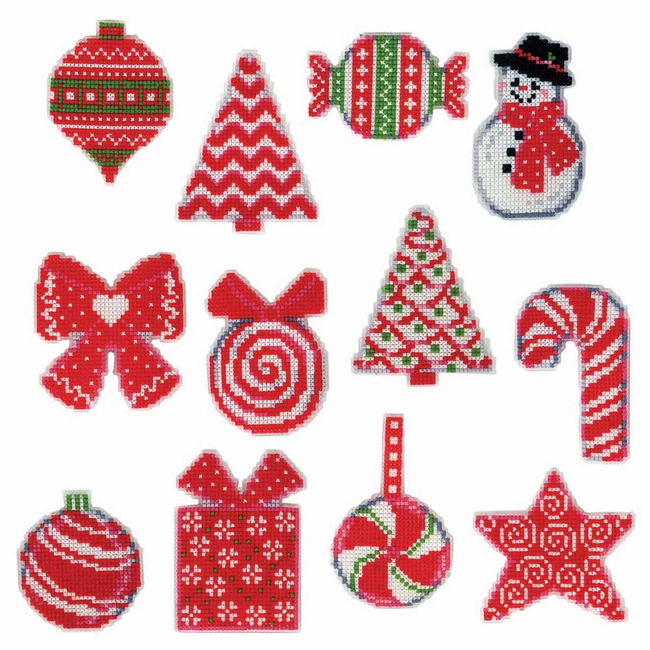 • Designs feature a candy cane, peppermint candies, a star, ornaments, a ribbon bow, a present, Christmas trees, and a snowman.