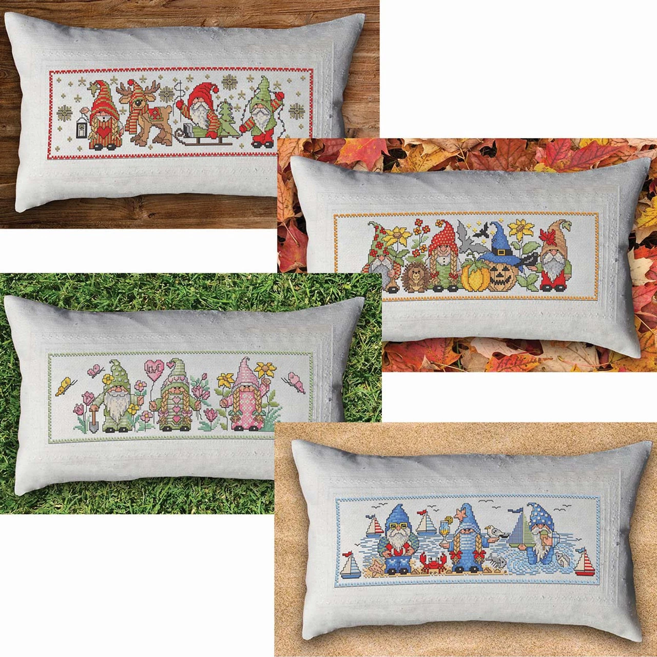 Spend a year with adorable gnomes as they enjoy the best of each season. These seasonal counted cross-stitch pillow covers feature a trio of gnomes spending a spring day in the flower garden, a summer day at the beach, an autumn day with a jack-o’-lantern and hedgehog at a pumpkin patch, and a winter day bringing home the Christmas tree with the help of a sled-pulling reindeer. Each design is stitched on a pre-finished natural-colored 14-ct. aida cloth pillow cover with a zippered backing. The easy-to-see squares of aida cloth make it a great fabric choice for both beginning stitchers and those with more experience. Each complete counted cross-stitch kit includes the pre-finished pillow cover, cotton floss, needle, and instructions. Pillow forms not included. Each finished pillow measures 20 x 11″ (51 x 28cm). Imported from Europe.