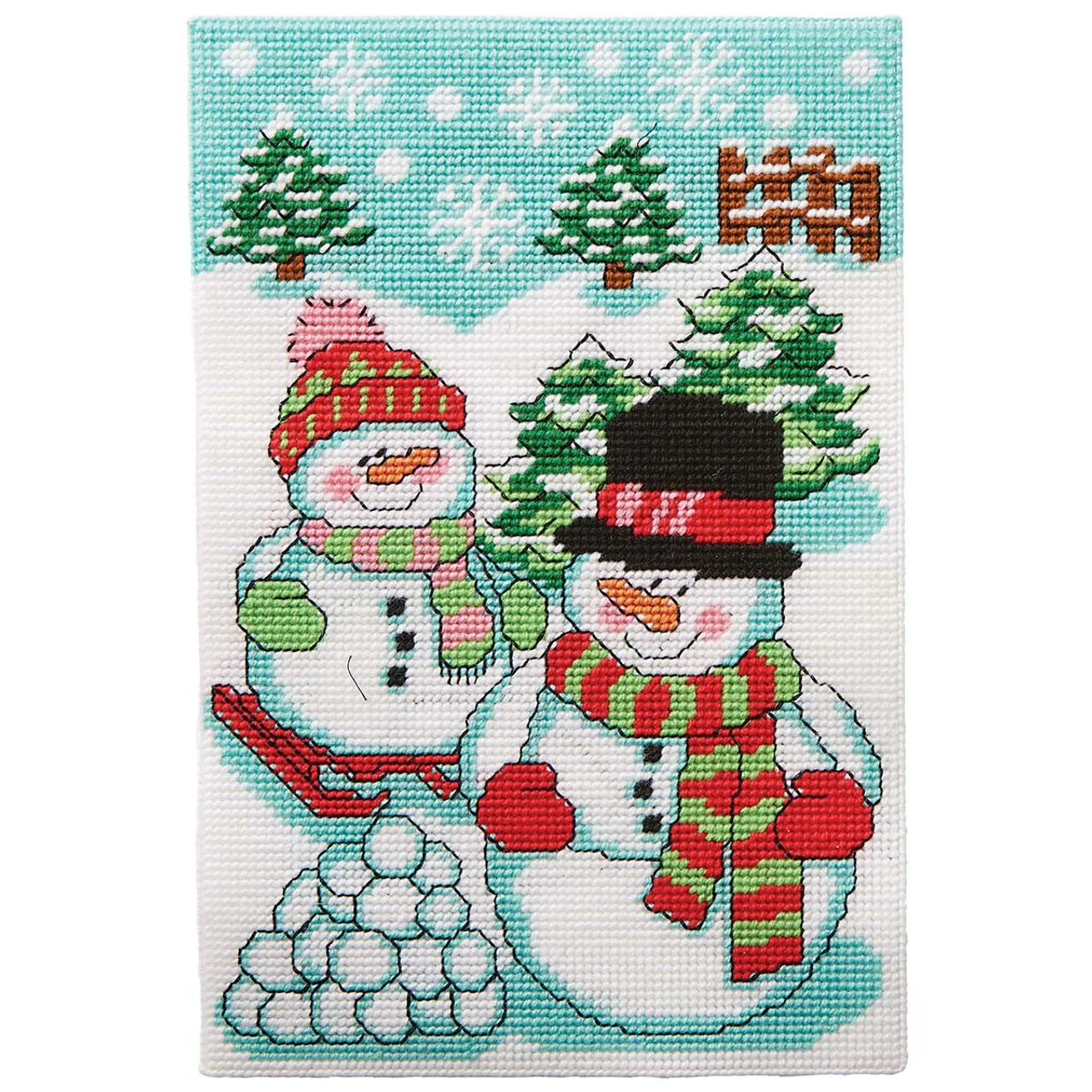 Cheer up wintry days with these playful snow pals. Kit includes 7-mesh plastic canvas, acrylic yarn, cotton floss, and needle. 12 × 18″ (30 x 46cm). Imported.