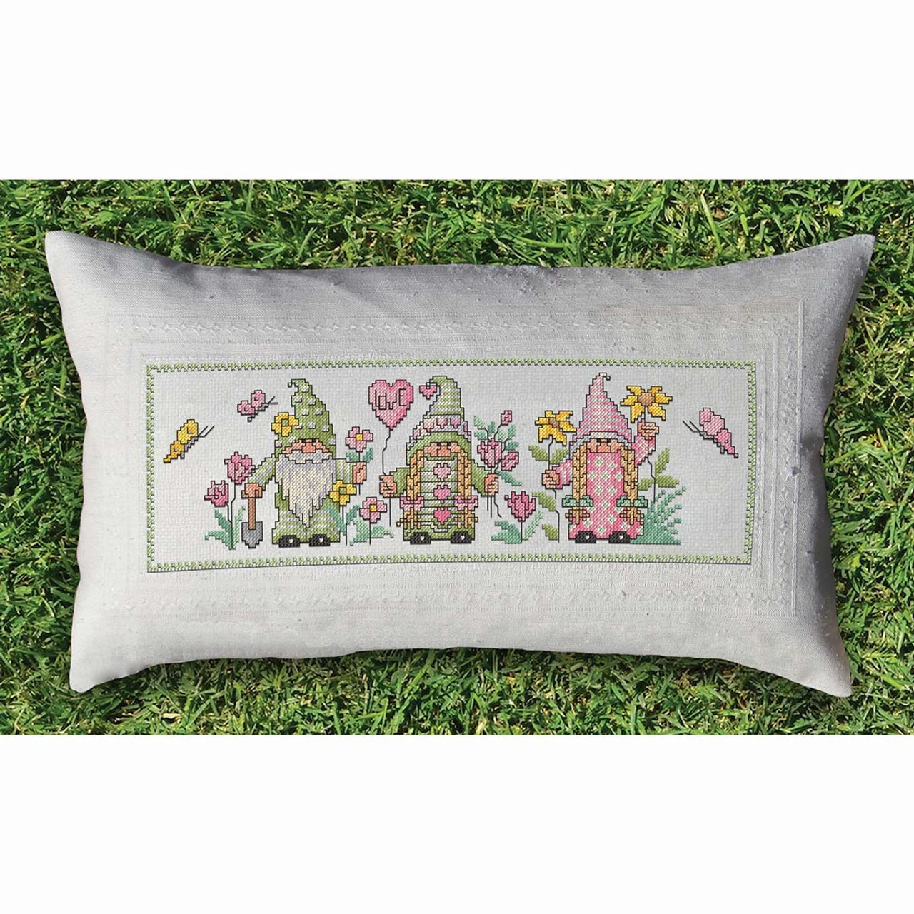 • Design features three gnomes in pastel green and pin clothes standing in a flower garden with butterflies, a balloon, and a garden spade.