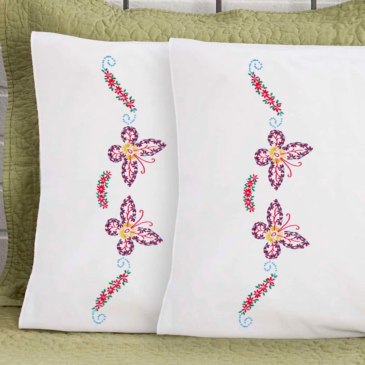 Delight in the whimsy of this playful pair of butterflies. Preserve the best of the past with the Revival collection, a selection of vintage needlework designs preserved from the archive and re-created for modern stitchers. Stamped for embroidery on white cotton/polyester fabric with a perle edge. Pair includes two 20 × 30″ (51 x 76cm) pillowcases. Imported.