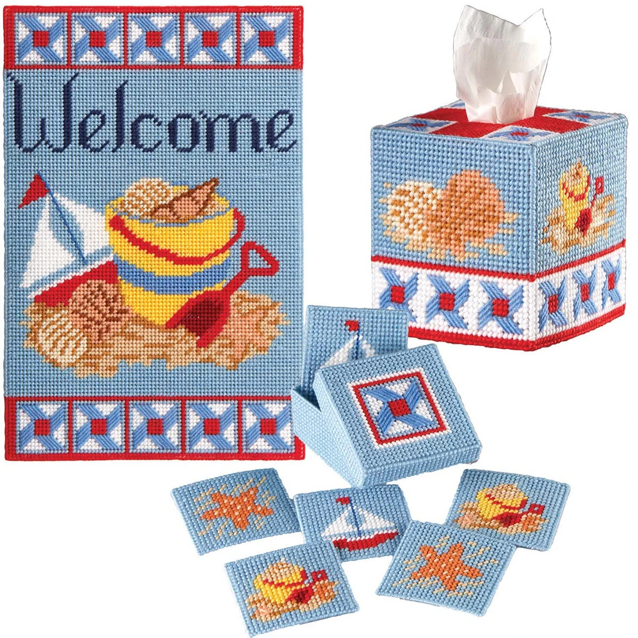 Save when you buy the complete set of summer plastic canvas accessories to decorate your home. Decorated with summer motifs like a sailboat, a sand pail and shovel, and nautical beach motifs, this playful set will have you dreaming of warm summer days at the sea. This complete kit includes 7-mesh plastic canvas, acrylic yarn, needle, and instructions to create a welcome sign wall hanging, tissue box cover, and set of six coasters with coordinating holder. Imported.