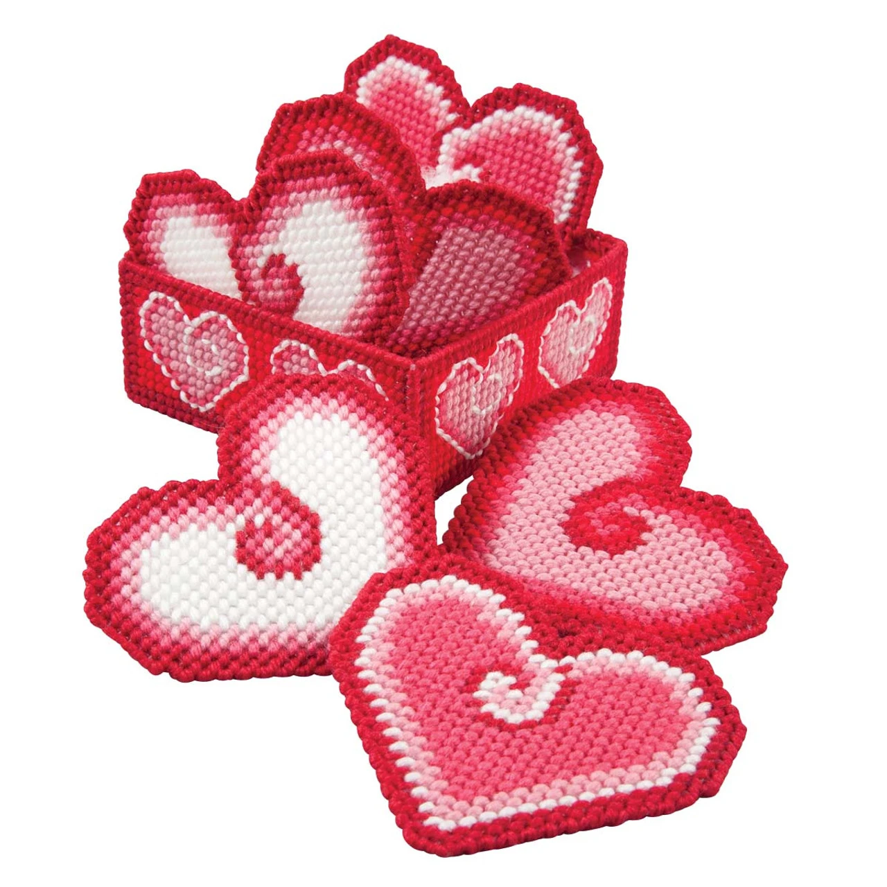 Show a little love to your tabletops with these heart-shaped coasters. Kit includes 7-mesh plastic canvas, acrylic yarn, felt for backing, and needle. Set of six 4½ x 4″ coasters and holder. Imported.