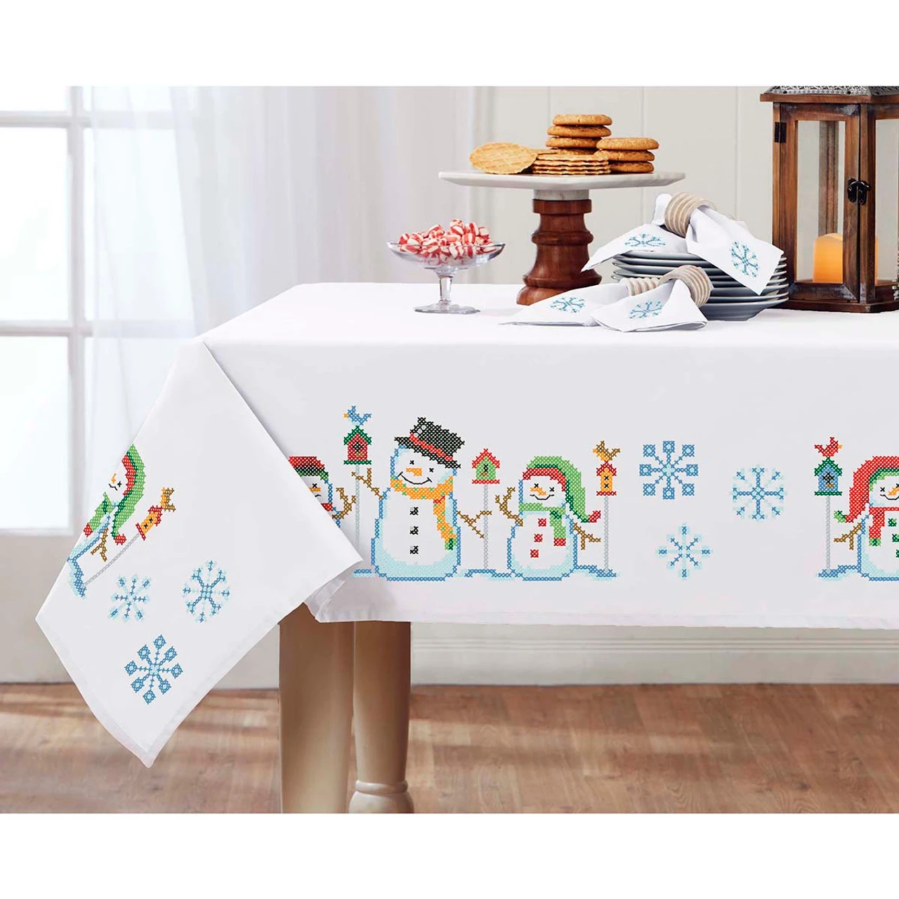 • This pre-finished tablecloth is ready for stitching with snowmen, birds, birdhouses, and snowflakes.