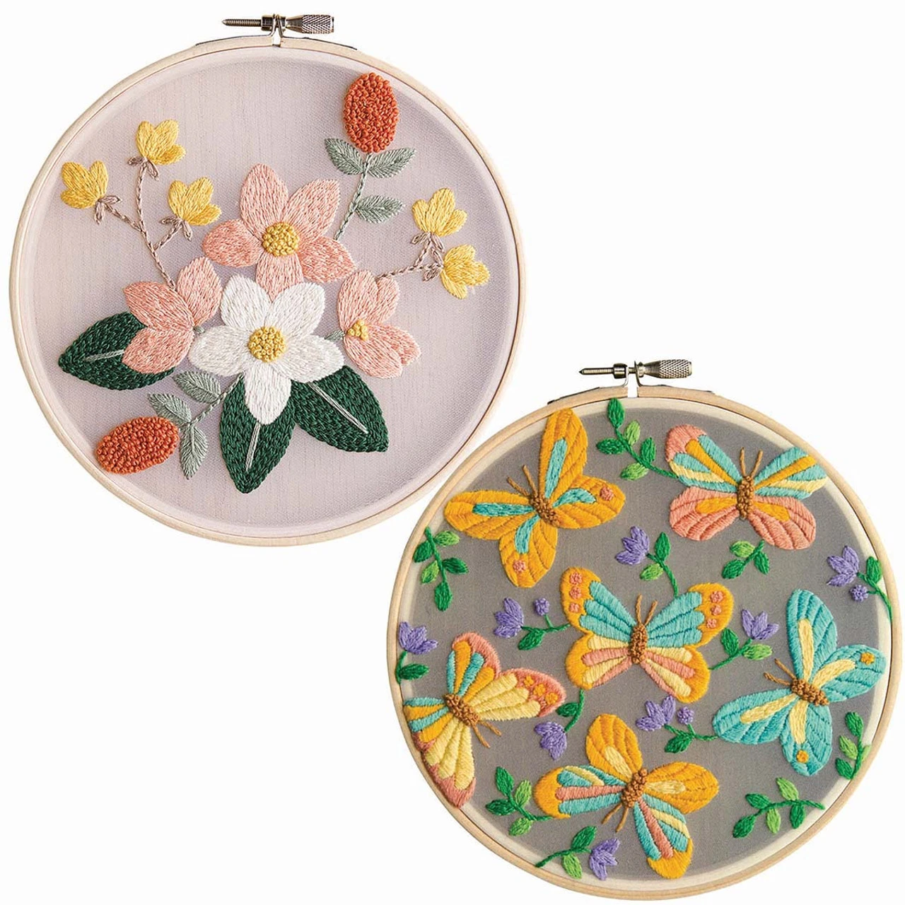 Stitched on sheer organza, these embroidered butterflies and blossoms appear to float through the air. Featuring a bouquet of pink and white magnolias surrounded by other flowers or a kaleidoscope of butterflies in vibrant shades of teal, orange, and yellow, these designs are perfect for spring decorating. Each design stamped for embroidery on white organza fabric. This kit includes the stamped organza fabric, cotton floss, needle, and instructions. The finished design measures 6″ (15.2cm) dia. Made in U.S.A.