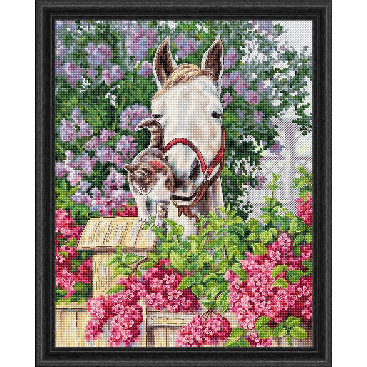 • Design features a gray cat and a white horse snuggling in a flower garden filled with purple and pink blossoms.