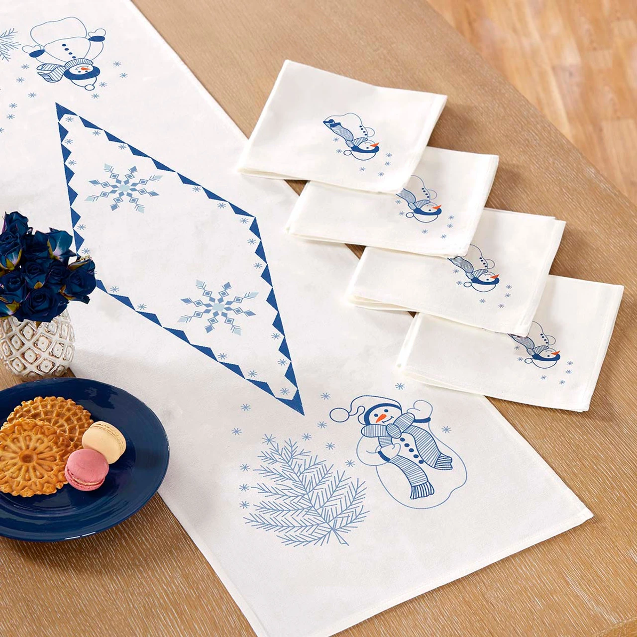 Invite these jolly snowmen to family dinners this winter! Stamped for embroidery on white polyester/cotton fabric with a hemmed edge.14 x 44″ (36 x 112cm) table runner; set of four 16 x 16″ (41 x 41cm) napkins. Imported from Europe.