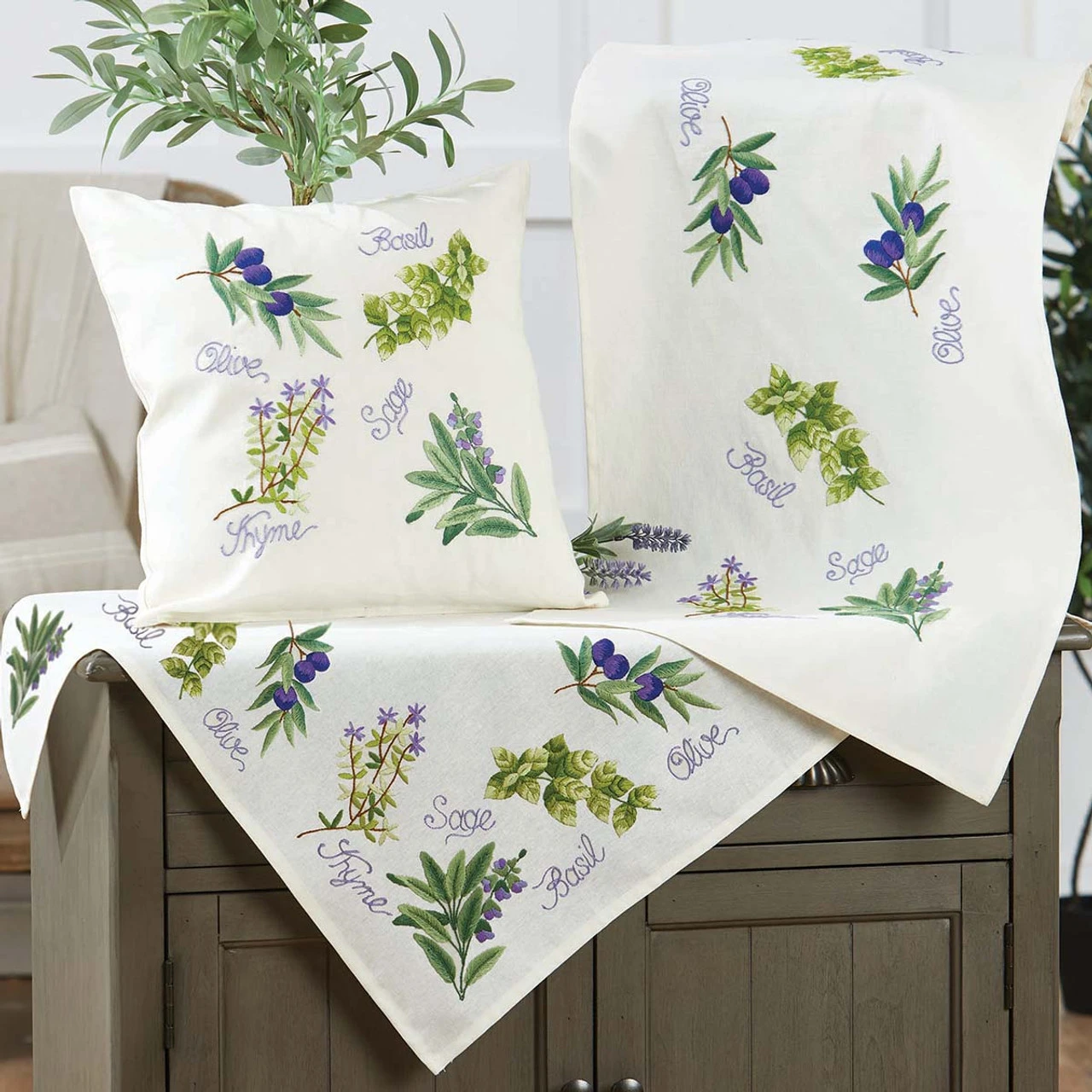 • These floral linens are ready for stitching with olive branches and a variety of fresh herbs including basil, sages, and thyme.