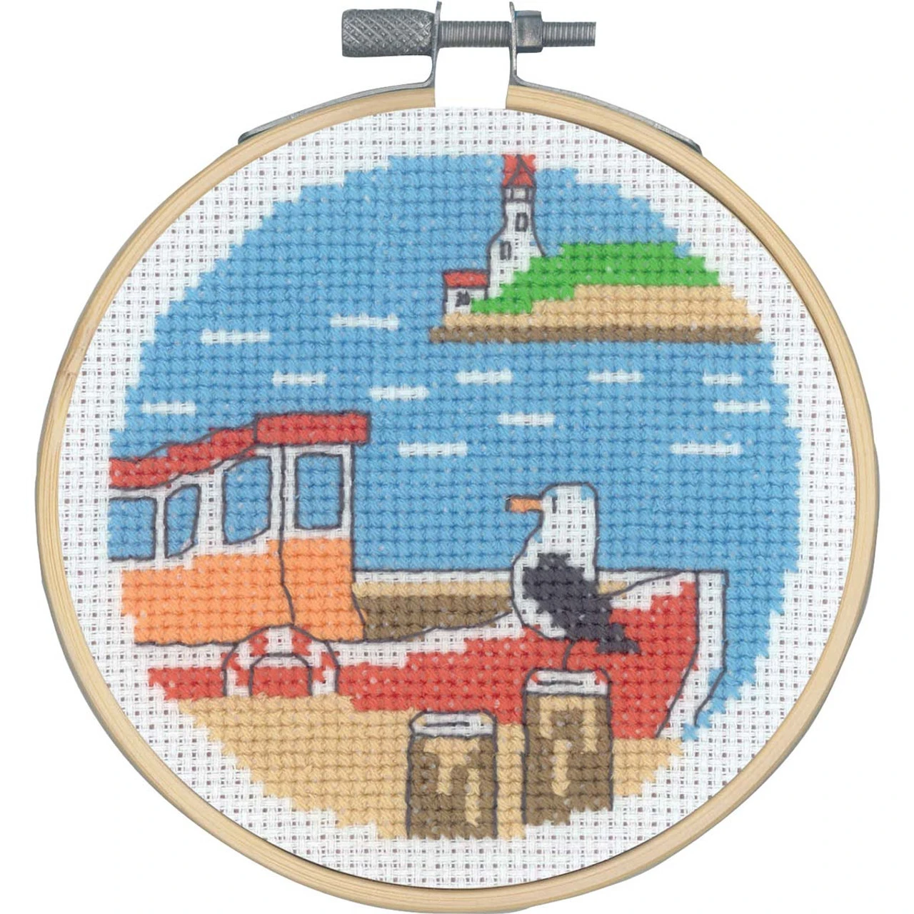 • This counted cross-stitch kit includes white 14-ct. aida cloth, DMC cotton floss, needle, and instructions.