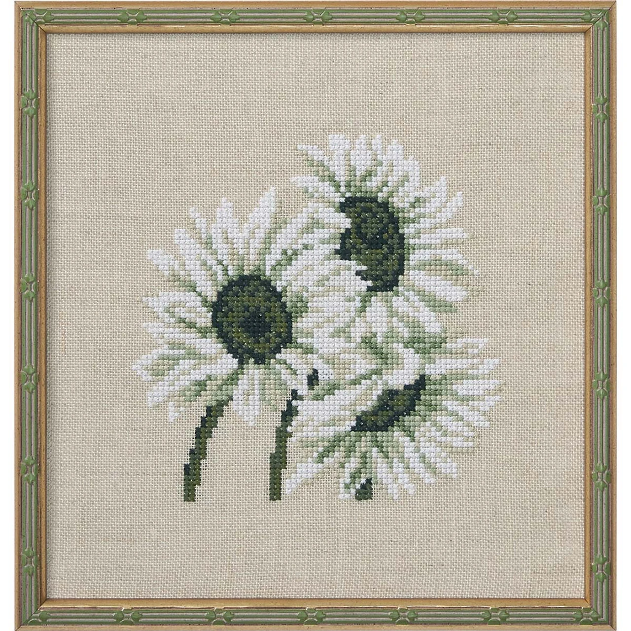 Sunflower blooms stitched in neutral hues lend an understated elegance to autumnal décor. Counted cross-stitch kit includes linen-colored 28-ct. linen, cotton floss, and needle. 7 x 7″ (17.8 x 17.8cm). Imported from Europe.