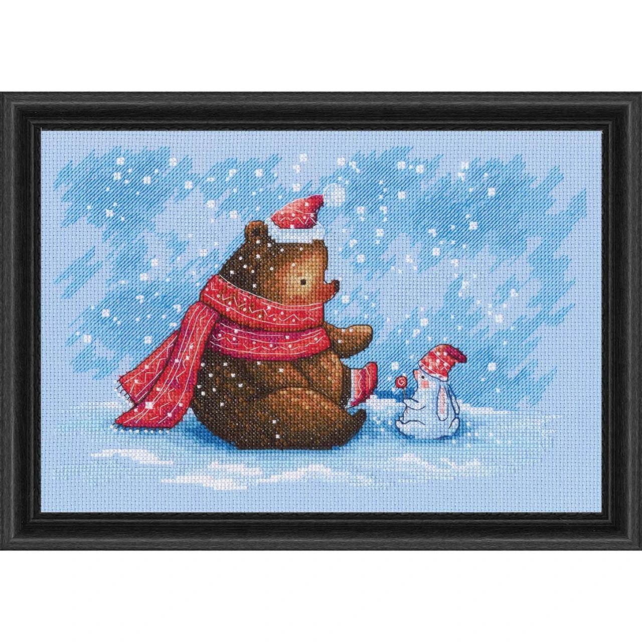 • Design features a bear and rabbit wearing red winter hats and scarves on a snowy winter day.