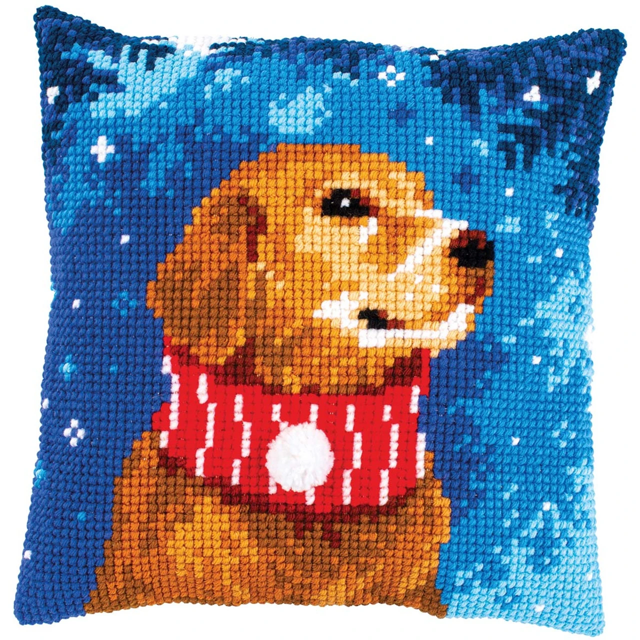 This wintry needlepoint pillow features a handsome golden retriever posing for a seasonal portrait! The dog is shown wearing a peppermint-striped scarf accented with a 3D pom-pom. A winter blue background filled with snowflakes makes this pup a fun guest in your sitting area all season long! This kit includes hand-painted 4.5-mesh canvas, 100% acrylic yarn, needle, and complete instructions. Pillow backing and pillow form are not included. As the high-quality canvas is hand-painted with the design, it makes the stitching process easier and faster as you can stitch more accurately and check the chart less as you work. The 4.5-mesh canvas allows for a high level of detail in the finished design. The finished pillow design measures 16 x 16″ (41 x 41cm). Imported from Belgium.